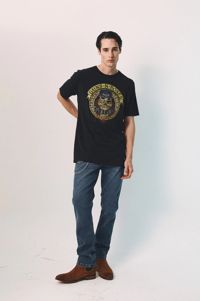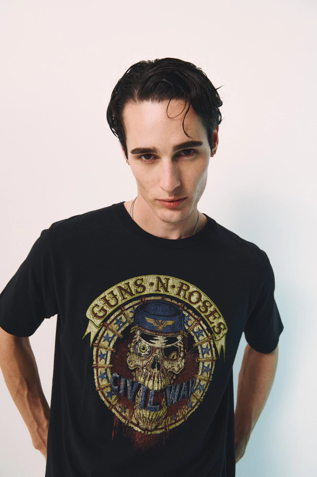 Sumá actitud a tu outfit con esta remera de calce regular, confeccionada en 100% algodón para una máxima suavidad. Presenta cuello redondo, mangas cortas y terminaciones al corte, brindando un look relajado y moderno. Ideal para fanáticos del rock y quienes buscan comodidad y estilo en su día a día. ¡Hacé la diferencia en cada ocasión!