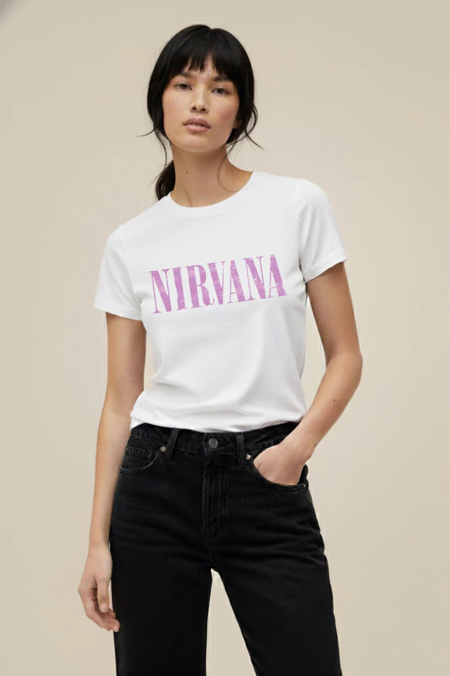 Su cuello redondo con ribb al tono, mangas cortas y calce regular logran un fit cómodo y favorecedor. El icónico logo de Nirvana en el frente aporta ese toque atemporal y rebelde, ideal para fans de la música y para quienes buscan sumar actitud a su look diario.