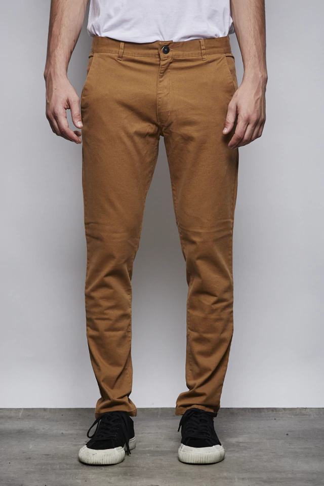 Pantalón en gabardina. tono camel tiro medio, calce slim, tejido confortable